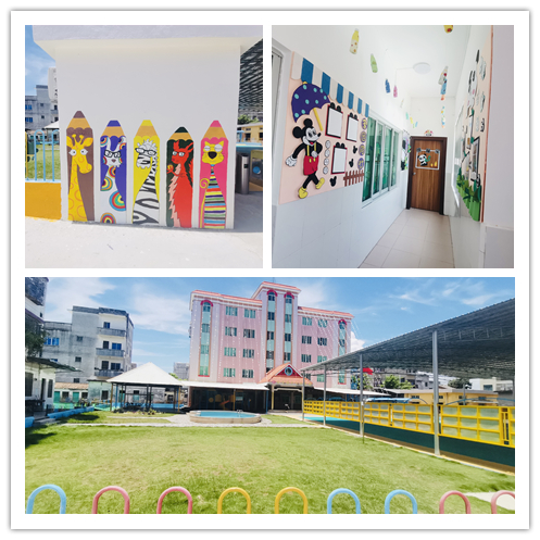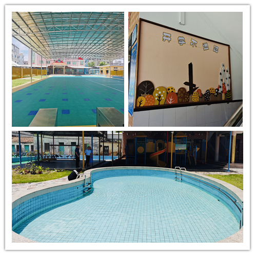 博賀鎮中心幼兒園創辦于1999年。園區建筑總占面積為3109平方米,園舍建筑面積1871平方米,戶外活動場地2205平方米,其中綠化面積1241平方米,綠化覆蓋率40%。園區環境優美,園舍布局合理。園區建有綜合樓一幢,分別設有園長室、衛生保健室、圖書室、音樂室及各種活動室。戶外設有游泳池、玩沙池和采用西班牙橡膠材料建成的運動場。今年暑假的園區擴改建翻新工程涉及幼兒園園區陳舊、廢棄校舍的拆除;戶外活動操場上方500平米不銹鋼遮陽棚的安裝;園區內校園文化走廊的翻新;戶外活動室的擴建等內容。擴建翻新工程完成以后,不僅能營造優雅的教學環境,增添校園文化的多樣性,還為校園安全提供了更多的保障。