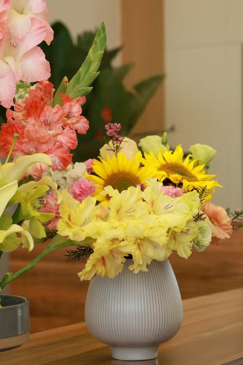 專業(yè)花藝師從色彩搭配、造型設(shè)計(jì)到花材養(yǎng)護(hù)展開生動(dòng)講解,將插花藝術(shù)與生活美學(xué)娓娓道來。女職工們化身“春日造夢師”,修枝剪葉、構(gòu)思層次,指尖流轉(zhuǎn)間,原本零散的花材逐漸煥發(fā)新生。有人將玫瑰與康乃馨編織成古典花甕,盡顯端莊大氣;有人以向日葵搭配綠植打造田園風(fēng)花籃,充滿生機(jī)活力。現(xiàn)場歡聲笑語不斷,四十余件作品或清雅秀麗,或熱烈奔放,宛若一首首無聲的春日詩篇。